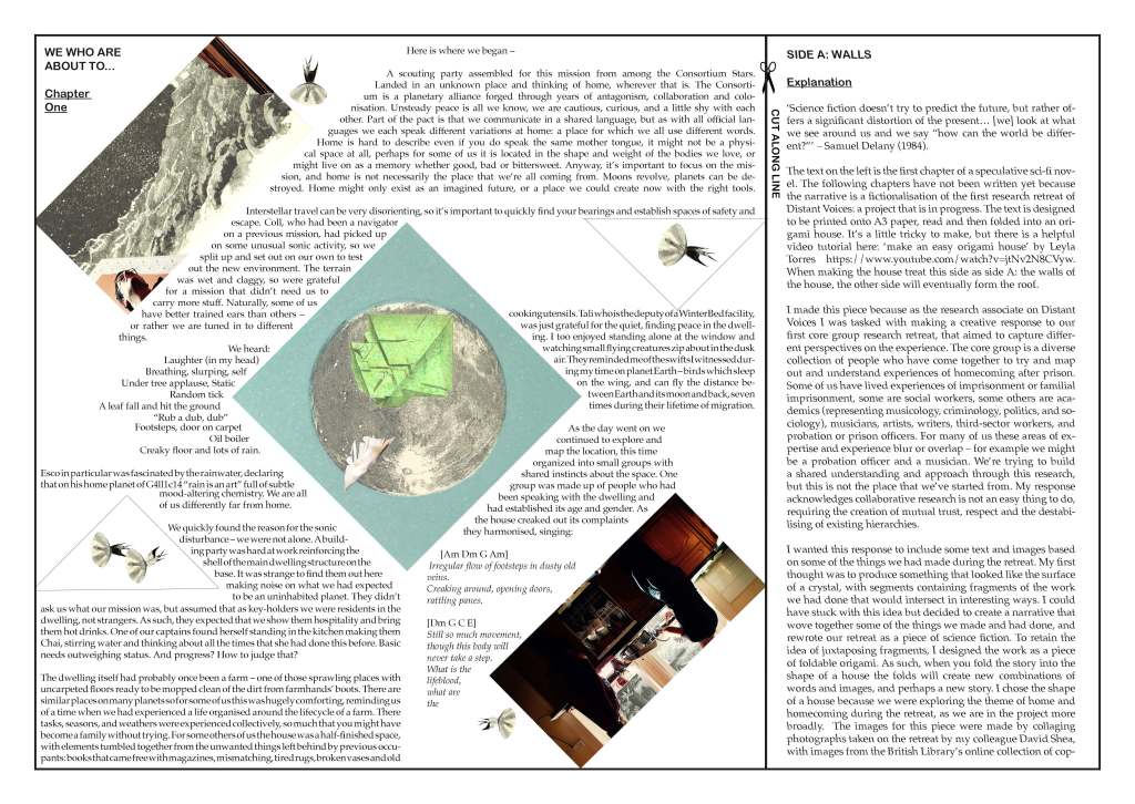The following chapters have not been written yet because the narrative is a fictionalisation of the first research retreat of Distant Voices: a project that is in progress. The text is designed to be printed onto A3 paper, read and then folded into an origami house. It’s a little tricky to make, but there is a helpful video tutorial here: ‘make an easy origami house’ by Leyla Torres https://www.youtube.com/watch?v=jtNv2N8CVyw. When making the house treat this side as side A: the walls of the house, the other side will eventually form the roof.